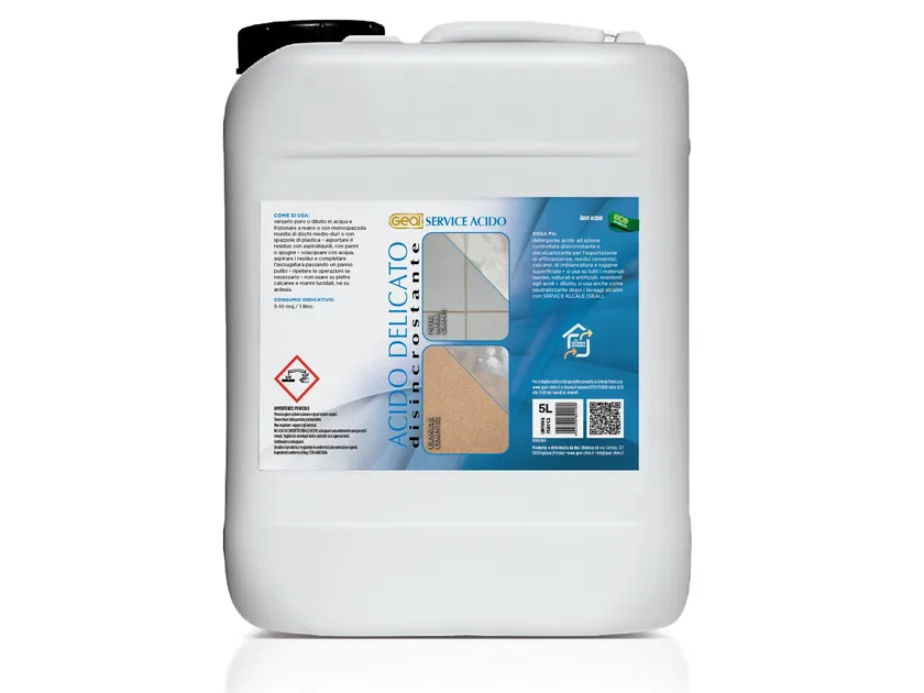 GEAL Service Acido è un detergente acido tamponato, privo di vapori irritanti, perfetto per eliminare residui cementizi, boiacche e stuccature post posa da superfici resistenti agli acidi come gres, cotto, klinker e pietre dure.
