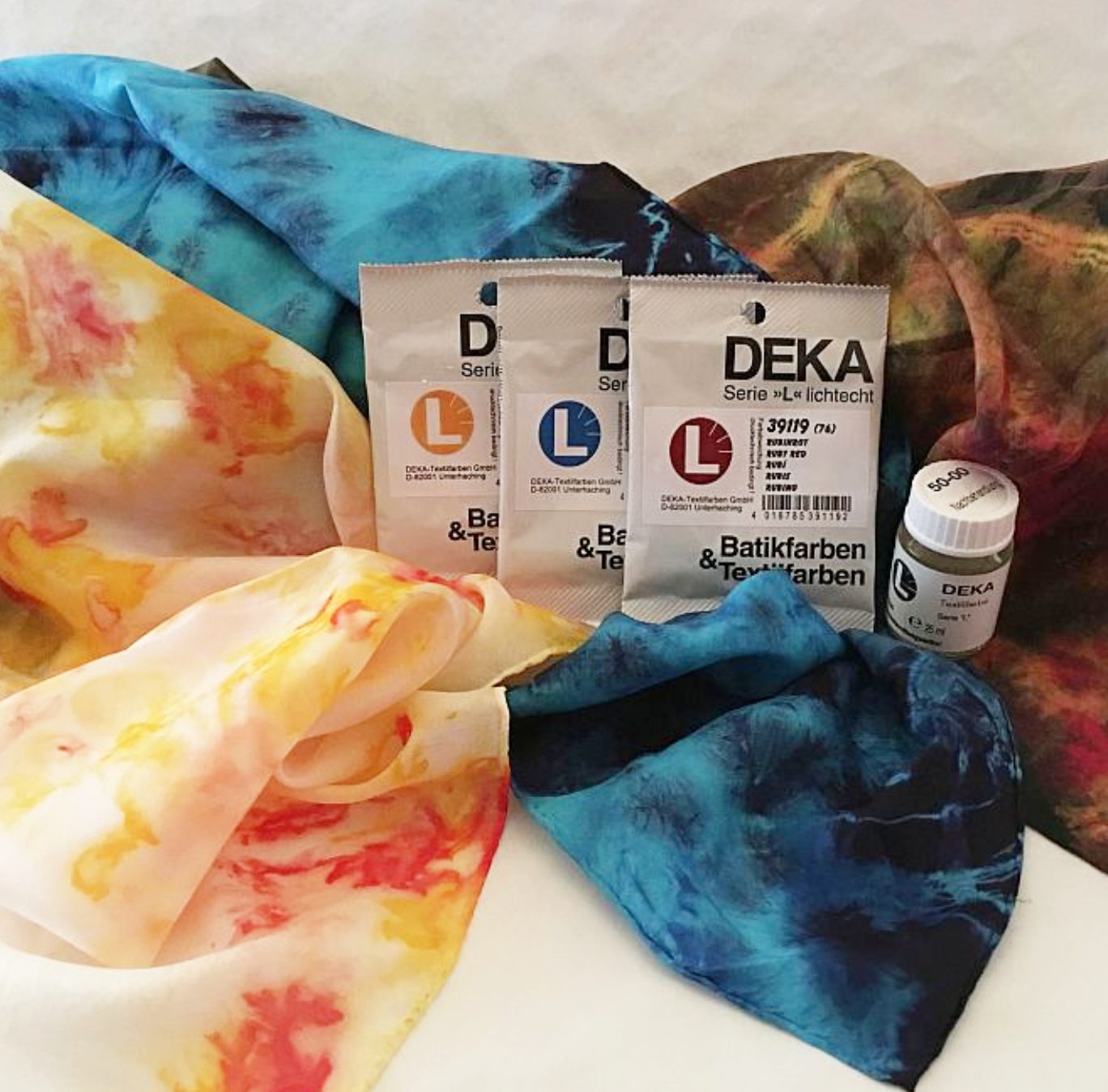 Colore assai rinomato da molti anni e molto diffuso per questo antico metodo di decorazione della stoffa importato in Europa dall’Asia. Creare un batik significa ottenere tramite colorazione un modello, in cui parti della stoffa sono state preparate in modo da non assorbire colore: o con la cera, nella tecnica a cera, o con dei nodi (nel tye & dye). L’applicazione dei colori per batik DEKA “L” è molto semplice e il lavoro finito dopo il trattamento col medium 111! “L” resiste in lavatrice fino a 30° C, lavaggio delicato. Si utilizzano su tessuti non finiti in fibre naturali – niente sintetici – sono tutti miscibili tra loro e sono caratterizzati da resistenza alla luce e brillantezza. Per il batik basta un sacchetto da 10 g per ca.125 g di peso secco della stoffa, per la tintura per circa 250g di peso secco della stoffa. Un sacchetto di polvere si scioglie in 2-5l d’acqua.