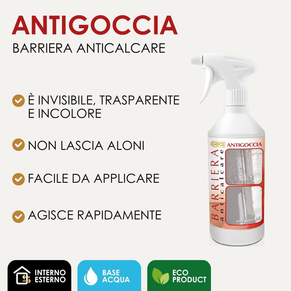 Il prodotto GEAL Antigoccia Spray 0.75L è un innovativo protettivo idrorepellente che crea una barriera trasparente contro acqua, sapone, calcare e aloni. Ideale per l’uso domestico e professionale, è perfetto per: