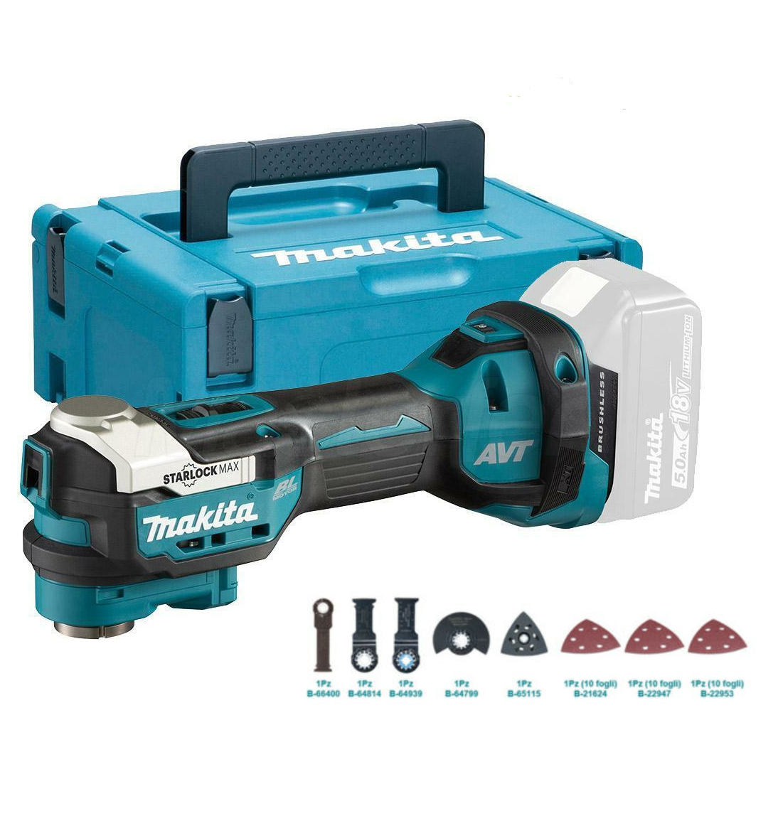 Makita DTM52ZJX1 è un utensile multifunzionale oscillante, che si presta a una grande varietà di lavorazioni. Questo utensile offre la possibilità di poter eseguire lavori di smerigliatura, taglio, levigatura e tante altre operazioni in ambito di costruzione e installazione. È dotato di attacco compatibile con il sistema Starlock, StarlockPlus e StarlockMax. Grazie al meccanismo oscillante vi garantirà tagli precisi limitando le schegge e gli scarti. Makita DTM52ZJX1 è lo strumento più adatto per tagli a tuffo. Le vibrazioni sono ridotte al minimo grazie al sistema AVT (Anti-Vibration Technology), sviluppato da Makita. Il motore è dotato di tecnologia brushless senza spazzole che garantisce una maggiore durata dell’utensile e manutenzione azzerata. La sostituzione degli accessori è facile e veloce grazie al sistema di fissaggio rapido, che non necessita di attrezzi. Il multifunzione si adatta alle varie lavorazioni di taglio o levigatura grazie al variatore di velocità. Il design di questo utensile vibrante a batteria è stato ridisegnato per essere sottile ed ergonomico per offrire il massimo comfort. Il motore offre una potenza pari a 370W.