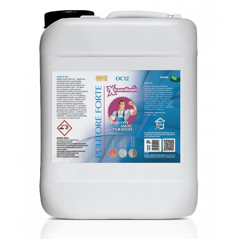 OC12 Geal è un detergente energico per superfici esterne. Rimuove efficacemente smog, graffiti e incrostazioni ambientali da materiali resistenti come pietra, mattone e cemento. 5lt